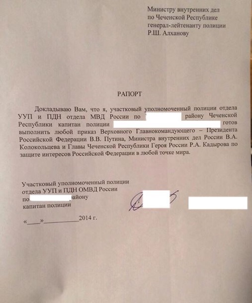 Около 500 сотрудников МВД Чечни отказались подписать рапорт о готовности выполнить любой приказ верховного главнокомандующего РФ Владимира Путина и главы Чечни Рамзана Кадырова, сообщает Новая газета.