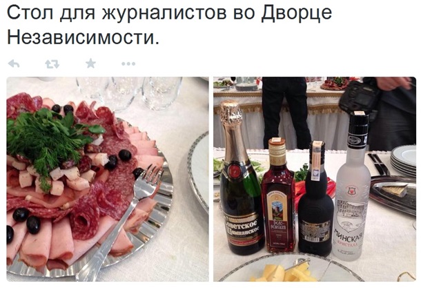 По словам Александра Лукашенко, он лично подносил кофе усатникам переговорного процесса. А кормили их "всем, что производят в Белоруссии и России". "Ели яичницу, сыр, молочные продукты, выпили несколько ведер кофе", - рассказал президент Беларуси. Журналистов кормили мясной нарезкой, им были доступны алкогольные напитки, что видно по фото, опубликованными жпредставителями СМИ: