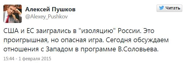 "США и ЕС заигрались в "изоляцию" России. Это проигрышная, но опасная игра", – написал он в своем Twitter в воскресенье, 1 февраля.