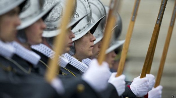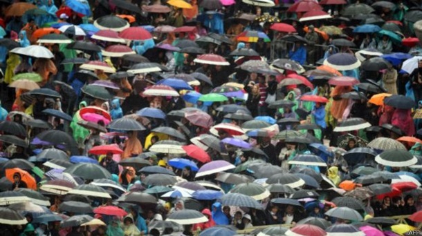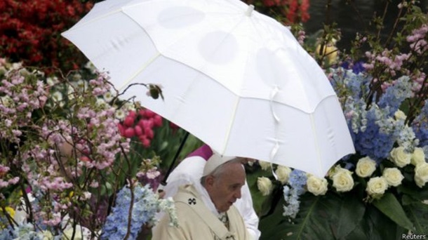 На украшенной цветами площади Святого Петра собралось множество людей. Они пришли сюда, несмотря на проливной дождь, который с утра без остановки идет в Риме.