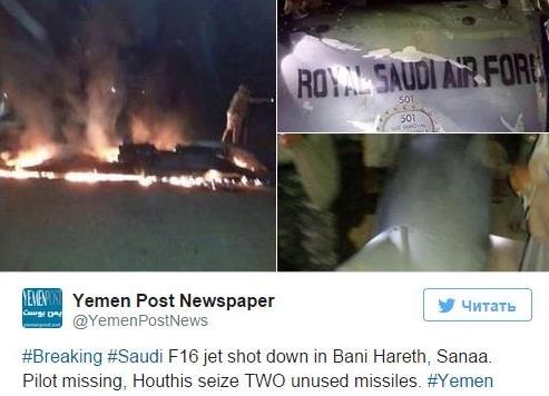 Истребитель F-16 ВВС Саудовской Аравии сбит неподалеку от столицы Йемена Саны, сообщает местная газета Yemen Post в своем микроблоге в Twitter.