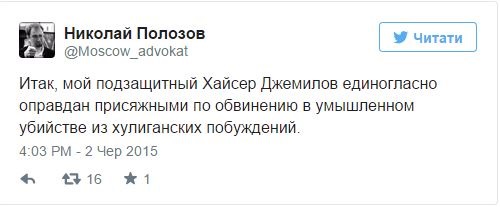 Присяжные признали сына лидера крымско-татарского народа Мустафы Джемилева, Хайсера, невиновным в убийстве. Об этом на своей странице в Twitter написал адвокат Джемилева Николай Полозов.