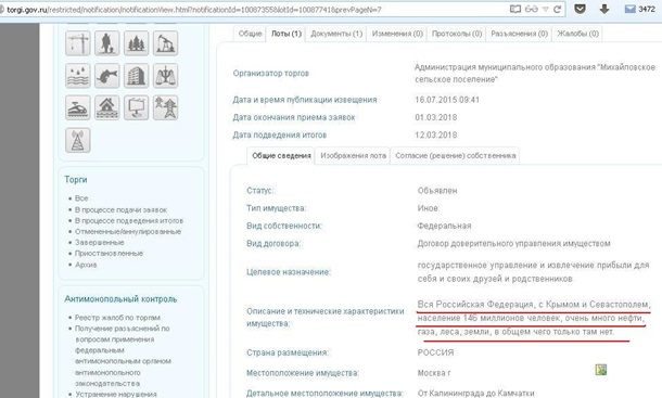 В описании лота указано, что заявки на конкурс принимаются до 1 марта 2018 года, а итоги подведут 12 марта 2018 года. Целевое назначение договора – государственное управление и извлечение прибыли для себя и своих друзей и родственников, отметило издание.