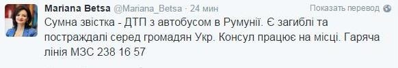 "Печальная весть - ДТП с автобусом в Румынии. Есть погибшие и пострадавшие среди граждан Украины", - отметила Беца.
