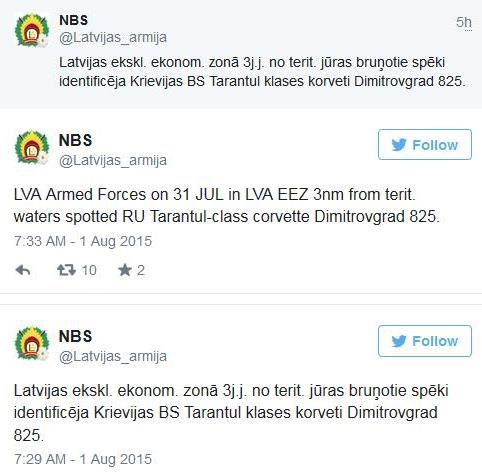 "31 июля на расстоянии трех морских миль (около 5 километров) от территориальных вод Латвии был замечен российский корабль "Димитровграда 825" класса "Тарантул"", - говорится в сообщении в Twitter.