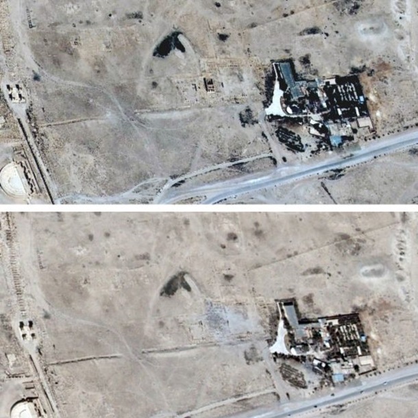 На снимке от 22 мая видно целое здание храмового комплекса. На снимке от 25 августа оно лежит в руинах. Снимки сделаны спутниками системы Pl