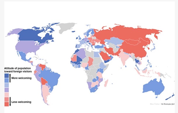 Карта составлена по докладу о тенденциях в сфере глобального туризма, опубликованному в рамках Всемирного экономического форума (ВЭФ), прошедшего в 2013 году. В течение года специалисты ВЭФ обращались к жителям разных стран с вопросом: "Насколько желанны иностранные гости в вашей стране?". По итогам опроса удалось выяснить, что гостей меньше всего ждут в России, Боливии и Венесуэле, в то время как самыми гостеприимными оказались Исландия, Новая Зеландия и Марокко.