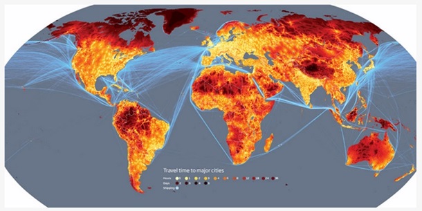 Карта, опубликованная в журнале NewScientist, показывает все самые труднодоступные места на планете. Она основана на количестве времени, которое необходимо затратить (с помощью любого вида транспорта), чтобы добраться из этих мест до населенных пунктов с населением от 50 тыс. человек и более. Были учтены факторы, замедляющие передвижение (пересечение границ, особенности ландшафта и проч.). Выяснилось, что 10% территории нашей планеты находится в очень плохой транспортной доступности – время на дорогу до ближайшего города составит здесь более 48 часов. Самым удаленным оказался Тибет, а именно точка с координатами 34.7°N, 85.7°E. Чтобы добраться отсюда до города Лхаса или Корла, понадобится три недели. Из этого времени на машине можно передвигаться только сутки, все остальное время придется пройти пешком.