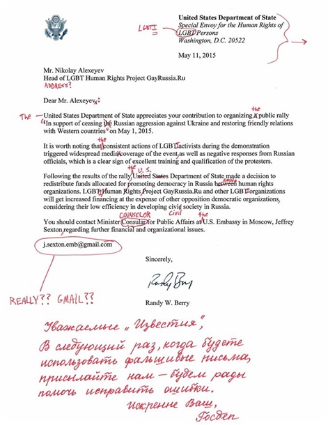 "Уважаемые "Известия"! В следующий раз, когда будете использовать фальшивые письма, присылайте нам – будем рады помочь исправить ошибки. Искренне Ваш, Госдеп" - написали в посольстве США.
