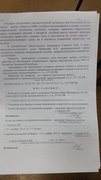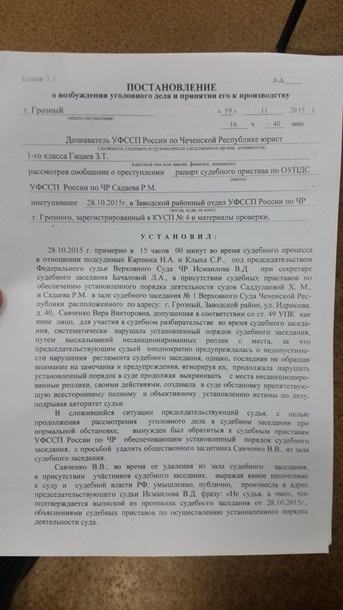 "Савченко В.В., во время ее удаления из зала судебного заседания... произнесла в адрес председательствующего судьи Исмаилова В.Д. фразу: "Не судья, а чмо", - сказано в поручении.