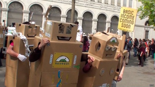 В стране уже состоялось несколько красочных демонстраций в поддержку предложения, в ходе которых по улицам Цюриха прошли сотни переодетых роботами активистов, обещающих освободить людей от повседневной обузы.