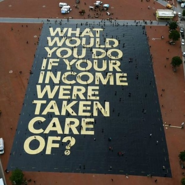 Сторонники предложения развернули на городской площади гигантский плакат с надписью: "Что бы вы делали, если бы получали гарантированный доход?"