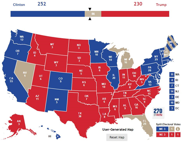 Если спланировать голоса в штатах по результатам экзит-полла на интерактивной карте, то это дает Клинтон 252 электоральных голоса, а Трампу — 230 голосов.