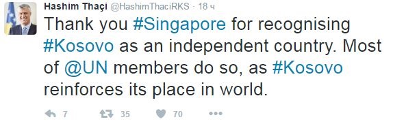 Сингапур признал независимость Косово. Об этом в своем Twitter заявил президент Косово Хашим Тачи.