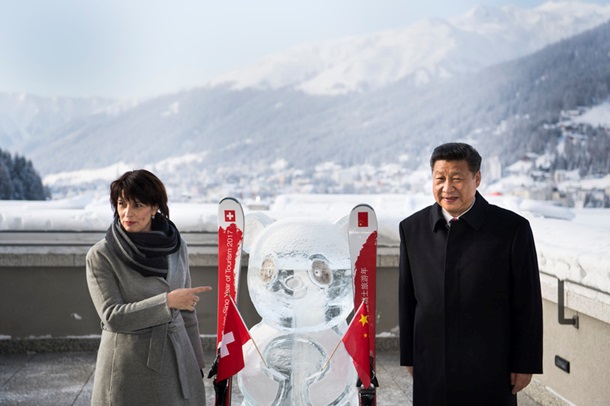 Давос-2017: мировые лидеры позируют возле ледяной панды. На фото - президенты Швейцарии и Китая