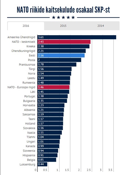Согласно данным портала Delfi, больше Эстонии в 2016 году тратили только США (3,61%), Греция (2,38%) и Великобритания (2,21%). Замыкает пятерку лидеров Польша – 2%.
