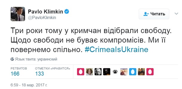 Вице-премьер-министр России Дмитрий Рогозин оскорбил министра иностранных дел Украины Павла Климкина за обещание вернуть оккупированному Крыму свободу. Климкин пообещал вернуть свободу крымчанам: "Три года назад у крымчан отобрали свободу. Насчет свободы не бывает компромиссов. Мы ее вернем совместно", – написал Климкин в в своем Twitter.
