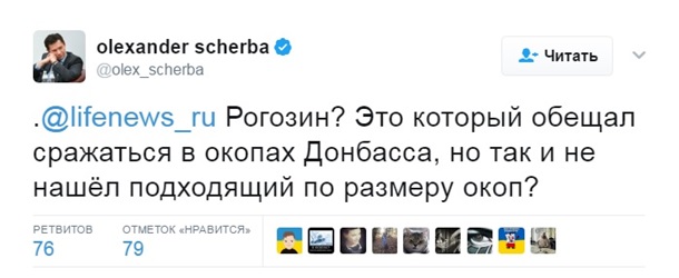 "Рогозин? Это который обещал сражаться в окопах Донбасса, но так и не нашел подходящий по размеру окоп?" – так прокомментировал посол Украины в Австрии Александр Щерба.