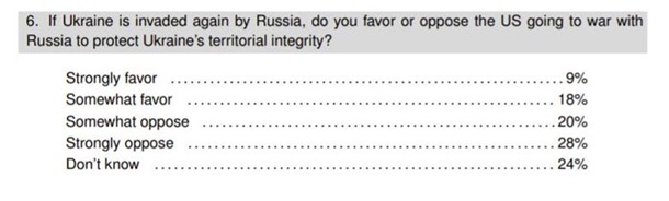 Вопрос звучал следующим образом: "В случае повторного вторжения России в Украину поддержите ли вы вовлечение США в военный конфликт ради защиты территориальной целостности Украины?"