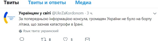 Граждан Украины не было на борту самолета, который разбился в Иране. Об этом сообщает Консульская служба МИД Украины в Тwitter в воскресенье, 18 февраля.
