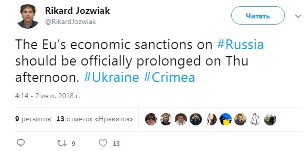 "Экономические санкции ЕС против России должны быть официально продлены в четверг после обеда", - написал Йозвяк.