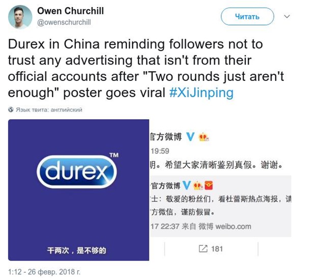 Своей мнение о том, что Си Цзиньпин хочет остаться болье двух сроков китайцы также выражали картинкой с пачкой презервативов Durex - и фразой "недостаточно сделать это дважды".