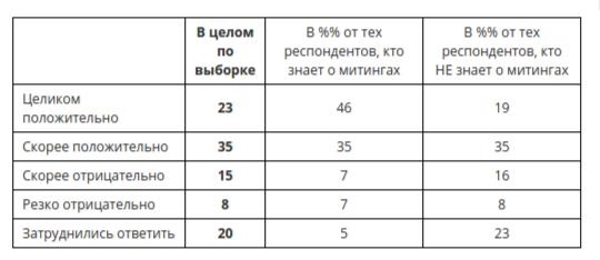 23 процента опрошенных россиян относятся к митингам целиком положительно, еще 35 процентов - скорее положительно, 23 процентов - отрицательно, еще 20 процентов опрошенных затруднились ответить.