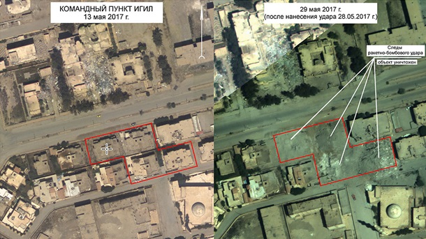 Позже в российском военном ведомстве опубликовали фотографию уничтоженного в районе Ракки командного пункта запрещенной ИГИЛ, в котором, по предварительным данным, в момент удара находился лидер группировки Ибрагим