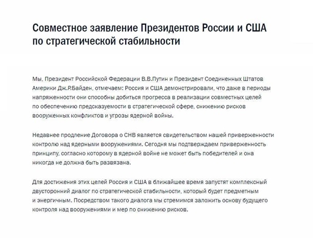 Опубликовано совместное заявление президентов США и России Джо Байдена и Владимира Путина относительно стратегической стабильности. Заявление сделано после встречи лидеров в среду, 16 июня.