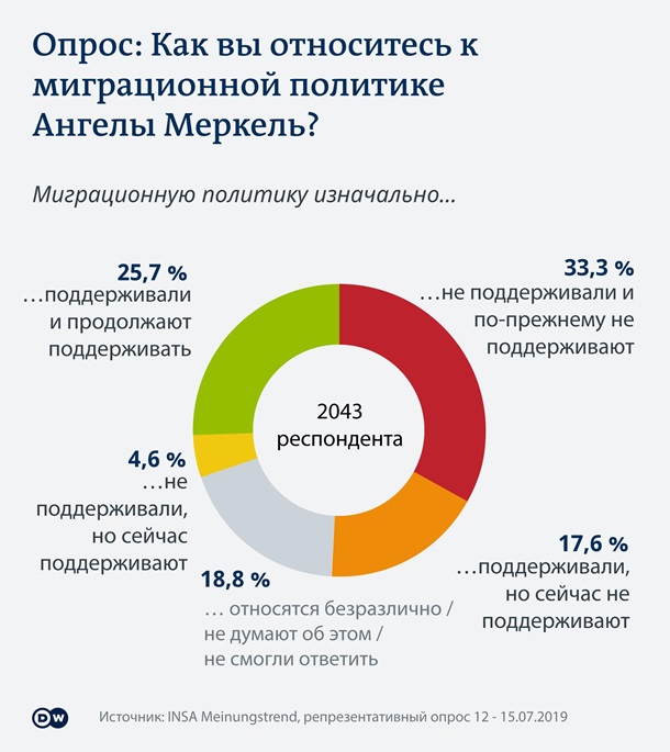 Что же касается отношения жителей Германии, то 11 процентов немцев считают, что Германия должна принимать больше беженцев, чем раньше. Более половины опрошенных жителей ФРГ не уверены, что с миграционным кризисом удалось справиться.