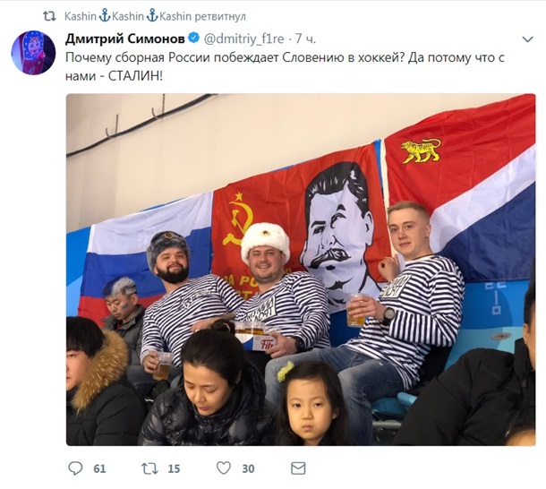 "Почему сборная России побеждает Словению в хоккей? Потому что с нами - Сталин", - написал Симонов.