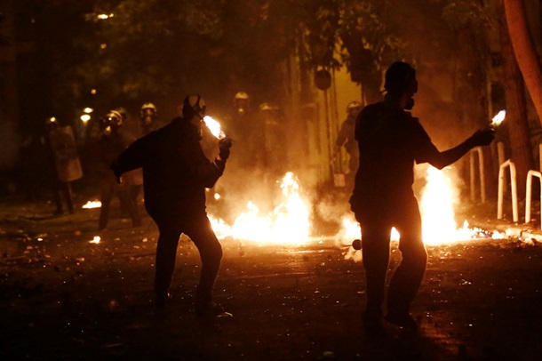 Сотни молодых людей напали на полицейских в Афинах, бросая в них камни, файеры и газовые снаряды. Полиция была вынуждена применить слезоточивый газ для разгона толпы.