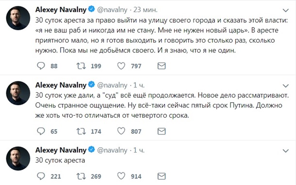 "30 суток уже дали, а "суд" все еще продолжается. Новое дело рассматривают. Очень странное ощущение. Ну все-таки сейчас пятый срок Путина. Должно же хоть что-то отличаться от четвертого срока", - написал Навальный.